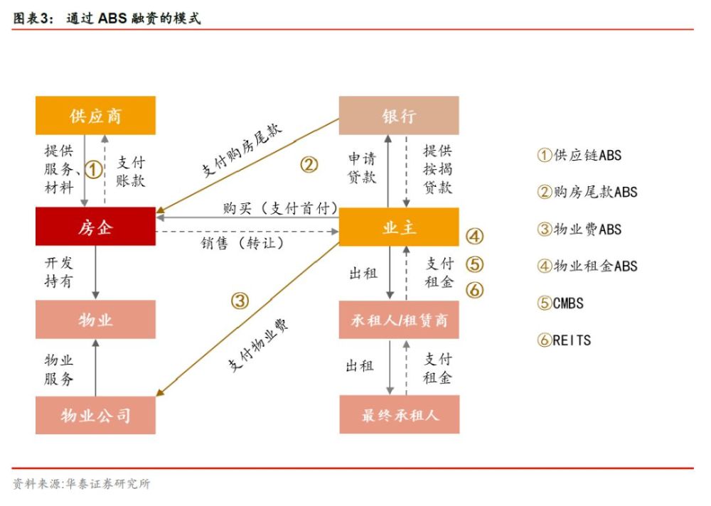房地产ABS按照基础资产分类主要有六种类型。供应链ABS:房企在项目开发过程中,需要向上游供应商采购各类服务和材料,并形成大量对供应商的应付账款,这部分应付账款可供进行供应链ABS融资;购房尾款ABS:在业主购房的过程中,往往需要向银行申请按揭贷款,银行放款一般需要3-6个月,这里房企就会沉淀一批应收购房尾款,这部分资产可供进行购房尾款ABS融资;物业费ABS:在不动产存续过程中,物业公司与业主签订物业服务协议,形成应收物业费,这部分资产可供进行物业费ABS融资;CMBS、REITs和物业租金ABS:物业持有人在持有物业过程中,可能需要通过物业所产生的租金或者增值收入来进行融资,这里又催生出了CMBS、REITs和物业租金ABS融资。