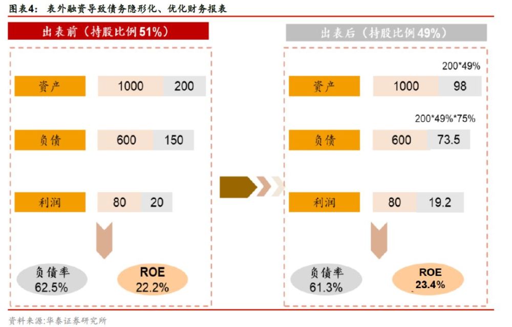 表外融资虽然缩减公司总资产规模,但可能提升公司利润指标。把部分子公司变为合营、联营公司后,虽然缩减公司总资产、营业收入、经营性现金流入等科目的规模,但公司仍按照比例分配合营、联营公司的利润,对公司的净利润不会产生较大的影响。因此,在净利润基本不变,总资产规模缩减的情况下,公司的利润指标有所提升。