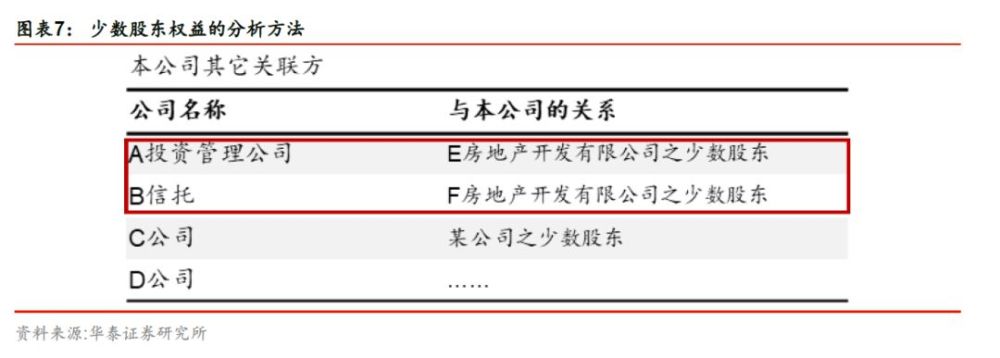 方法二:结合公司少数股东权益的绝对规模、波动情况及股东性质进行分析。如房企选择并表子公司且在合并报表层面上会计师认定为权益投资,但实质上为债务属性,则投资方的投资体现在少数股东权益中。如果公司少数股东权益规模较大,意味着公司的合作项目可能较多,且持股比例不高或控制力不强。一方面,要重点关注房企是否存在少数股东权益频繁大规模变动情况;另一方面,可关注附注或公开资料中披露的少数股东权益主体性质,如果为基金、资管、信托等,意味着存在表外负债的概率较高。