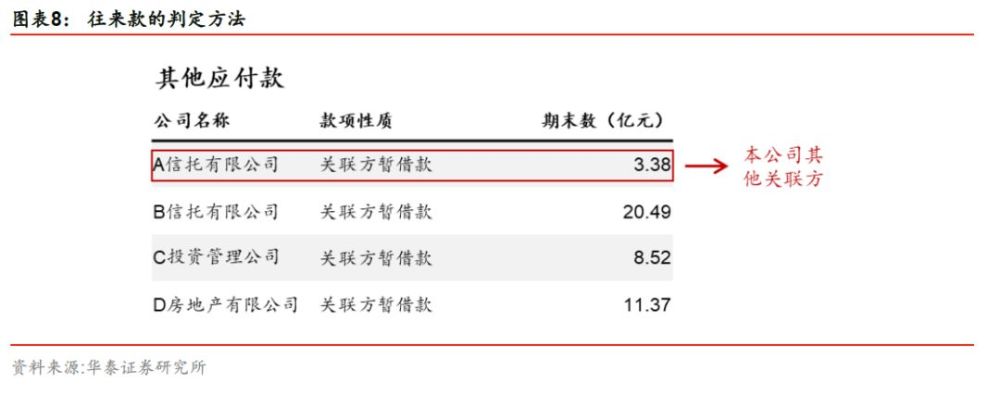 方法五:关注往来款的绝对规模及资金占用情况。由于房地产开发项目的开发周期相对较长,与投资方约定的收益支付周期则相对较短,所以产生了项目公司收入确认滞后于销售现金回笼的情况。因此,在实际操作过程中房企的项目公司通常通过与投资方之间的往来款项(其他应收、其他应付科目)来达到提前分配收益的目的。因此,建议关注其他款、其他应付款科目的规模、差值、具体主体的资金往来情况。如果往来款项规模较大、存在对母公司大量的资金占用以及与金融类企业的关联资金往来,代表着表外负债存在的可能性较大。