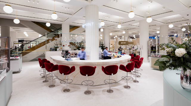 出彩的实体商业自营空间都少不了有创造力的长期合作方。2016年,伦敦 Selfridges 百货饰品自营区改造,与英国本土设计公司 David Chipperfield Architects 合作,不仅将室内环境翻修,还在自营区中央加入了一个14座的环形鸡尾酒吧台,将一方小小的餐饮区嵌入众多奢侈品牌之中,成为整个区域的点睛之笔。