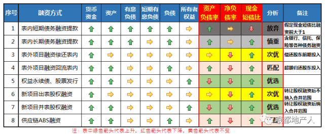 5. 表中列举情形均为融资提款,反向则为融资偿还,所以当企业面临三条红线指标超标时,则可以通过反向操作或者用优选、次优方式替换应放弃、慎重及匹配的情形(例如进行股权融资偿还短期有息负债),对公司三个指标进行针对性改善。