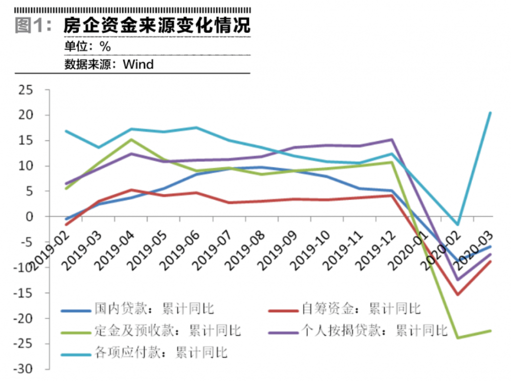 其次新冠疫情给房企带来的冲击是资金层面。2020年1-2月,房企开发资金来源合计20209.94亿元,同比下降17.9%。从资金结构来看表现出以下三个特点:第一,除却自筹资金外,定金及预收款和个人按揭贷款下降最多,两者同比分别下降23.9%和12.4%;这主要是来自销售端的冲击,平常两者占开发商无息负债约50%,销售活动的骤停导致无息负债来源急剧减少。随着疫情稳定以及销售活动的恢复,这两项资金来源也出现一定程度的反弹。第二,国内贷款相对下降较少,2月同比下降8.6%,这与疫情期间的金融纾困政策有较大关系。2020年1月31日,中国人民银行联合财政部、银保监会等联合下发了《关于进一步强化金融支持防控新型冠状病毒感染肺炎疫情的通知》,要求对受疫情影响严重的企业到期还款困难的,可予以展期或续贷,这对缓解房企融资难发挥了一定作用。第三,各项应付款下降比例最少,2月同比下降1.5%。这其中主要是各项应付工程款,这说明开发商在整个供应链中依然处于强势地位,伴随着复工复产的推进,建筑商的各类垫付款进一步增加,3月房企各项应付款同比上升20.5%。