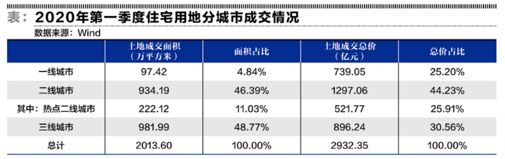 新冠疫情期间住宅用地市场经历了先下跌后快速反弹的走势。土地供给方面,一季度三个月住宅用地供给面积分别为1712.88万平方米、950.25万平方米、3299.74万平方米,同比增速分别为-0.4%、-26.64%和47.5%。土地成交方面,绝对量的走势与土地供给一致,一季度三个月住宅用地成交面积分别为1630.46万平方米、1057.07万平方米、1490.31万平方米,同比增速分别为-26.84%、-15.4%和-2.95%。2月份住宅用地成交大于供给,主要原因是一些开发商在获得债券融资后加强了优质土地的竞拍;3月份住宅用地成交小于供给,主要原因是三线城市供给加大,但开发商竞拍意愿不强。
