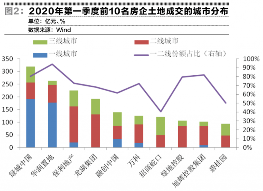 城市土地市场的分化,与资源向头部房企集中有较强相关性。一线和二线热点城市的住宅用地总价高,往往只有实力强的开发商才能竞拍成功,甚至某些情况下需要联合竞拍才能获得。2020年一季度共有49家房企成功拍得住宅用地,前10家房企的土地成交总价达到1687.68亿元,占总成交款的57.55%。从这10家房企所竞拍土地的城市分布来看,除了招商蛇口和碧桂园在一二线城市的份额较低外,其他8家房企在一、二线城市住宅用地市场的平均份额达到75.68%。