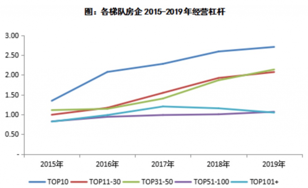 但对于中小房企而言,由于自身议价能力及品牌性较弱,快周转能力不强,经营杠杆比较难提高。所以,目前使用经营杠杆比较明显的还是TOP50的房企。