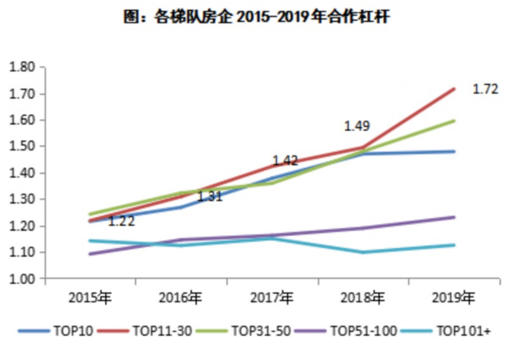 据克而瑞统计,近五年来,TOP50的合作杠杆基本呈快速上升趋势。