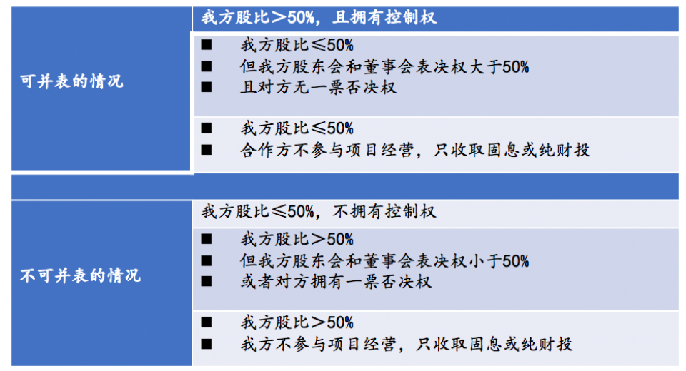 通常来说,大中型房企跟小房企合作,一般是大房企拿到并表权,那如果是实力相当的两家房企合作,谁来并表,关键判断在于谁有控制权,即董事会和股东会的表决权是否占有大多数。陌爷地产圈针对并表与不能并表的情况制作了以下图表: