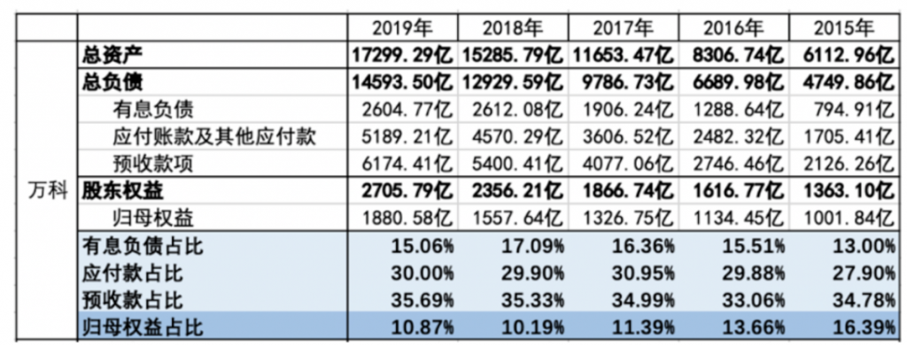 以万科为例。从2015年到2019年,万科的应付款和预收款占比远高于有息负债占比,且呈现逐年上升的趋势。
