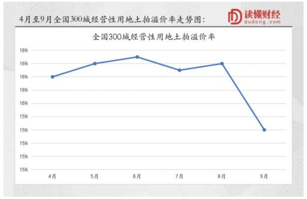 4月至9月全国300城经营性用地土拍溢价率走势图: