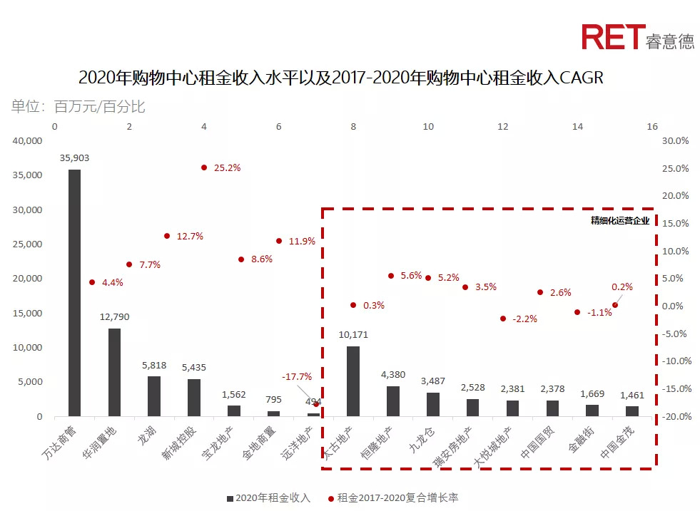 精细化运营企业通常表现为低增速、小体量,覆盖一二线城市核心商圈,商业能级多为城市级。目的是打造全服务链条的城市综合体,代表企业为九龙仓、龙湖地产、恒隆地产、大悦城地产等。