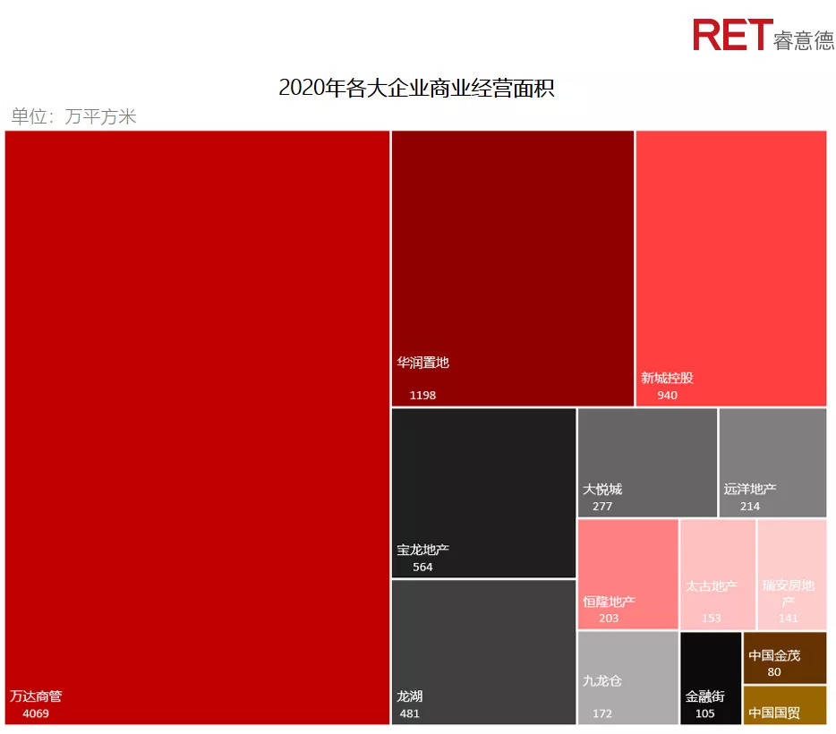 营运规模是衡量一家上市公司运营能力的基础,疫情下,头部房地产企业运营规模稳步上升,整体呈现积极拓展的态势。2020年,万达商管经营面积仍保持领先,整体运营面积达4069.11万平方米,同比增长4.4%;新城控股营运面积增长率最高,整体营运面积为940万平方米,同比增长59.15%;新城控股营运面积的上升得益于吾悦广场数量的大幅增长,截止到2020年12月31日,新城控股新增吾悦广场38座,达成2020年开业100家吾悦广场的既定计划;远洋地产和龙湖涨幅均超过20%,依旧保持平均增长态势。