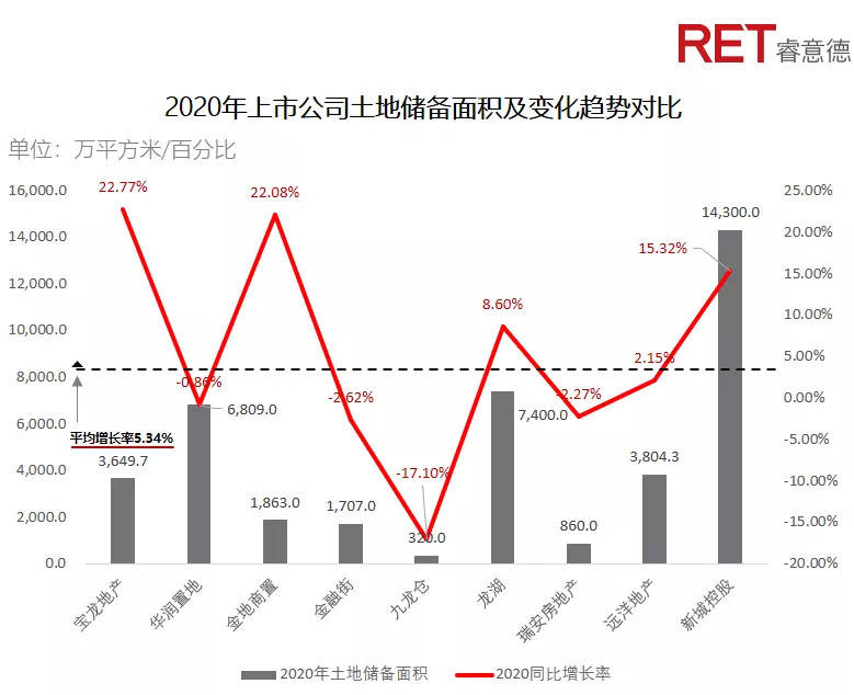 整体上市公司的土地储备情况呈现两极分化的态势。调查组中,宝龙地产、金地商置的土地储备增长较高,土地储备涨幅均突破22%;土地储备面积最大的新城控股土地储备量突破14,300万平方米,同比增长15.32%;九龙仓在土地储备上出现了明显的收敛,储备面积降幅达17.1%;受疫情影响,华润置地、金融街地产的土地储备量在四年里首次下降。