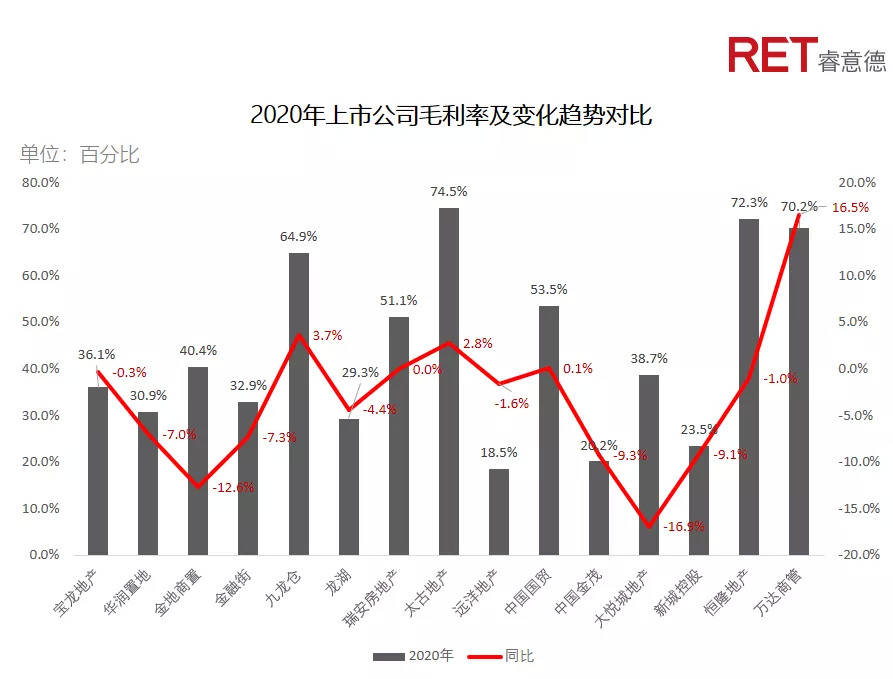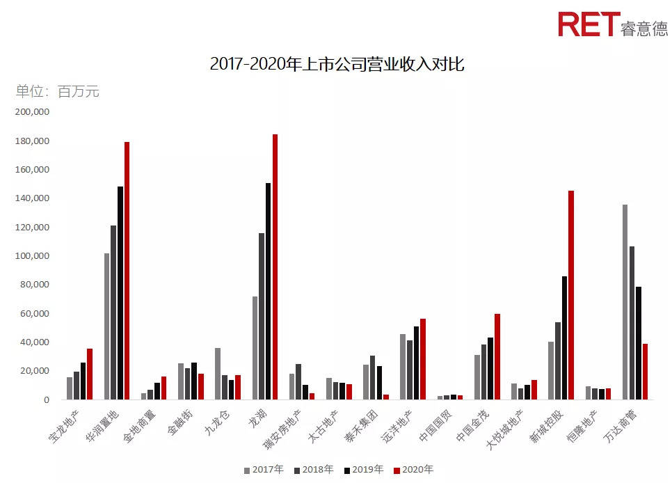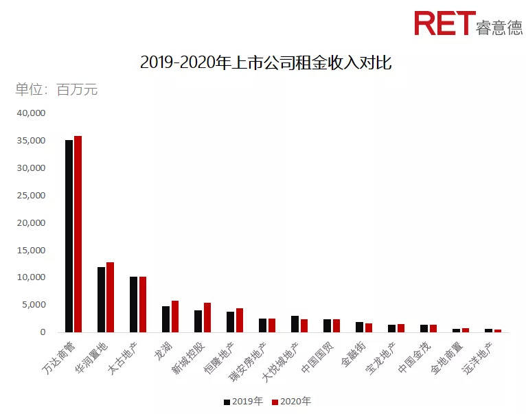 2020,商业地产板块上市公司营业收入呈现两极分化状态。其中新城控股涨幅领先,同比增长69.46%,华润置地、龙湖地产营收均增长超20%,有明显扩展的趋势,泰禾地产营收降幅最大,同比下降84.7%,万达商管营收下降50.25%,主要受酒店管理圣汐游艇等板块的影响。