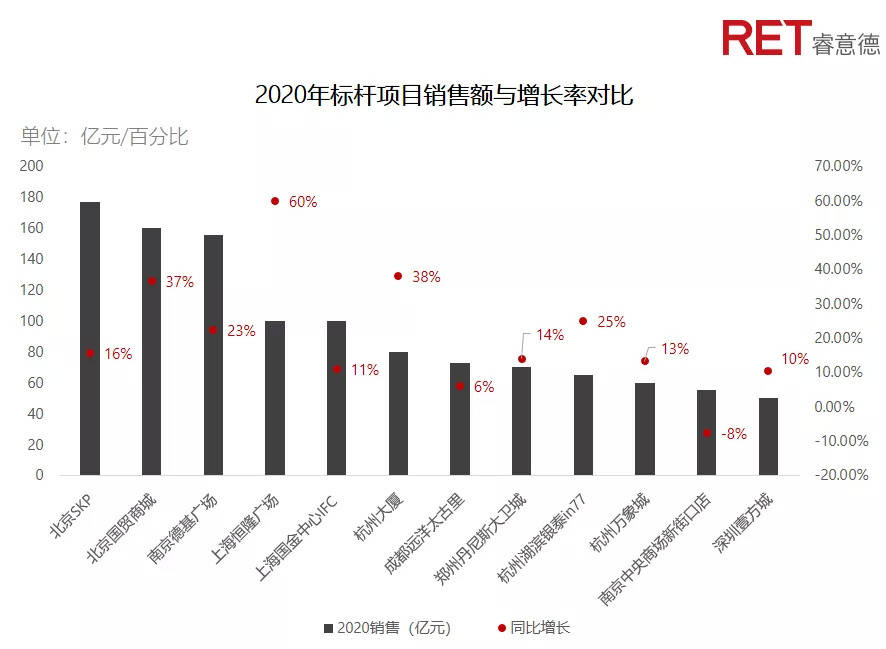 得益于国内疫情的有效控制,线下消费从四月份开始回暖,奢侈品消费从海外回流,推动高端购物中心销售额实现大幅增长。北京SKP以177亿元的业绩,再度成为2020年度购物中心的店王,业绩同比增长15.69%;上海恒隆广场的销售额同比上涨近六成,成为2020年营收增长率最高的购物中心;南京中央商场新街口店为调查组中唯一呈现负增长的标杆购物中心。