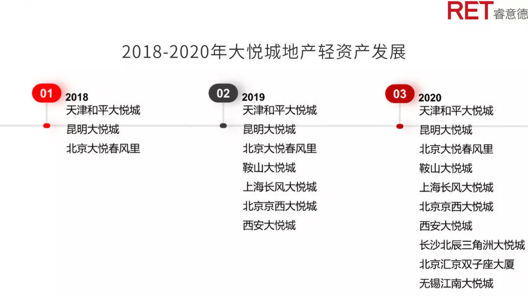 对于精细化运营企业来说,精细化运营企业的轻资产拓展战略通常体现在规模和品牌的共同发展。一方面,精细化运营企业需要通过轻资产战略来缓解其存量物业租金收益增长进入瓶颈期,整体营收增速放缓的问题,利用规模化战略开拓新的区域市场并从品牌输出等专业化运营中获取租金回报收益;另一方面,精细化运营企业可以通过重资产运营来维持其现有品牌力,塑造标杆项目扩大影响力,大悦城地产通过并购、管理输出、合作等方式,可以从资产持有者的身份逐渐让渡到资产管理者,在通过轻资产运营手段迅速扩大规模的同时拥有足够的资金去增强现有的品牌价值。