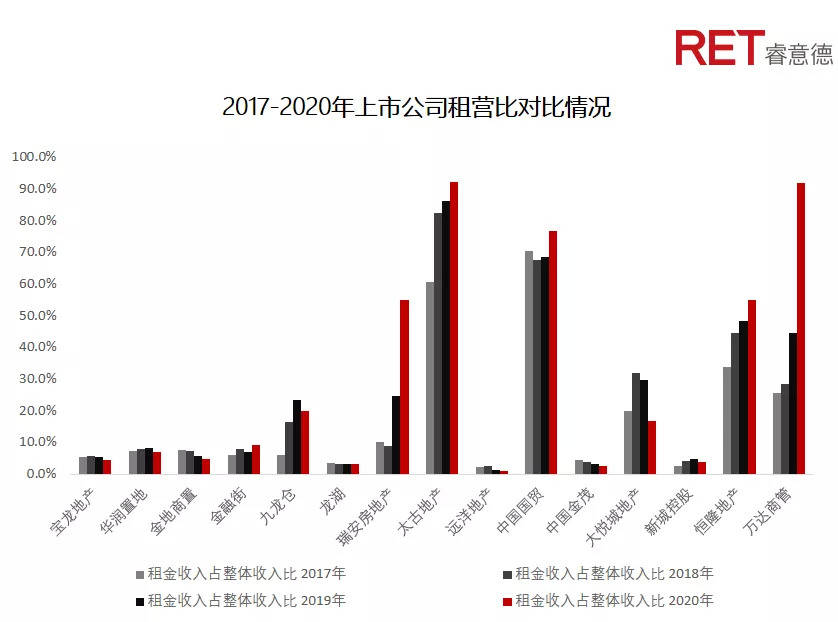 头部房企的租营比波动不大,部分上市公司呈现逆势上涨的趋势。万达商管的租营比上涨最多,达91.7%,同比上涨47.1%,增长的主要原因为万达商管轻资产战略的实施;大悦城的租金占比下降12.8%,租金收入降幅达22.3%,除去2019年处置上海长风大悦城与西安大悦城的影响,租金收入实际下降15.9%,下降原因是大悦城在疫情期间采取了租金减免政策所致。从租营比来看,商业地产板块仍表现活跃。
