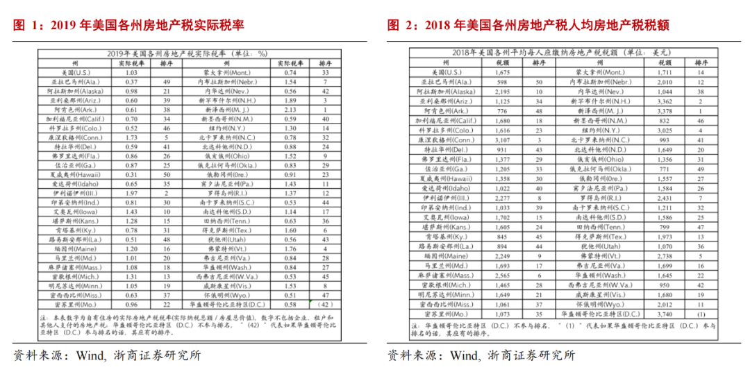 美国房地产税存在属地差异,如何观察各地税负?由于各地方政府的财政资金缺口不同,房地产税的税率设定也存在差异,体现出美国房地产税的属地差异,那么如何综合评价美国各地的房地产税税负?我们可以从两个角度来观察房地产税的实际税负,1)每人应缴纳房地产税税额可以衡量绝对水平的高低;根据美国税收基金会计算,2018年美国每人应缴纳房地产税税额最高的是新泽西州(3378美元),最低的是亚拉巴马州(598美元),两者相差近6倍。2)各州房地产税的实际税率;根据美国税收基金会计算,2019年新泽西州的房地产税实际税率最高,达到2.13%,夏威夷州的房地产税实际税率最低为0.31%。