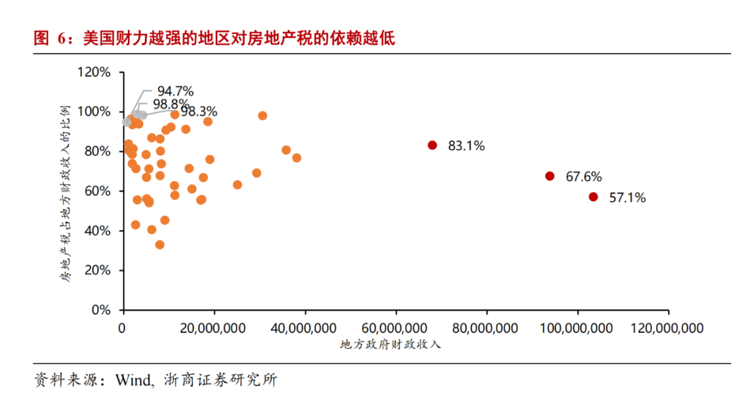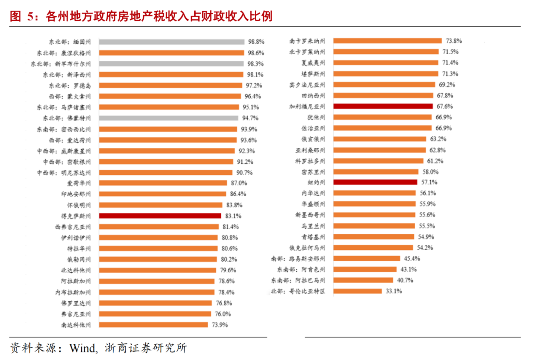 财力越薄弱的地方政府,对房地产税依赖度越高。地方政府对房地产税征收的自主权强化了地方财权,增强了区域间的异质性。地方财力比较强的地区房地产税收占比差异较大,如地方财政收入最高的纽约州、加利福尼亚州和德克萨市州房地产税占比分别为57.1%、67.6%和83.1%,原因在于其税收结构更加灵活。而财力弱的州则更依赖房地产税收入,房地产税收入占比集中在90%以上。侧面反映出房地产税对于补充地方政府税源的重要性。