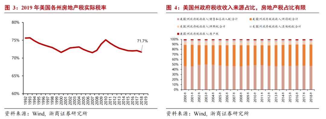 房地产税率设定反映出补充税源的思路。美国采用以支定收的财政纪律,美国三级分税制将税收征管权下放,各个州及地方政府可以自行设定房地产税税率,每年在地方政府预算立法程序中确认。在房地产税税率确定的过程中,是基于地方政府预算支出的资金需求和其他税收的缺口来确认的,可以理解为“有多少资金缺口征多少税”,因此从税率设定过程也可以验证补充财政收入的思路。