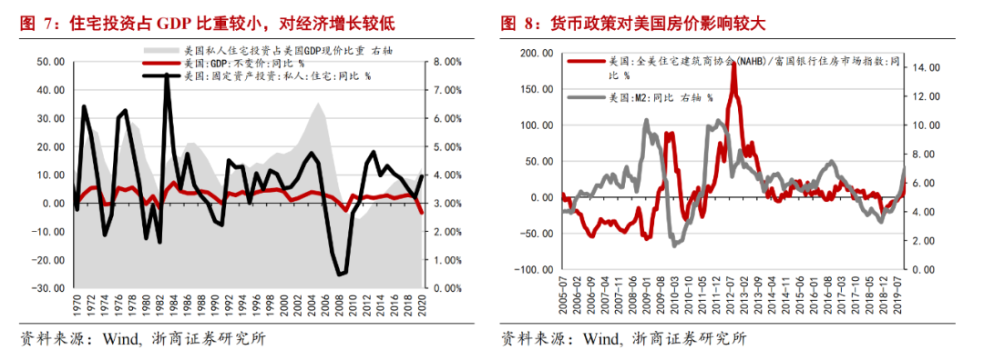 我们认为,调节作用借鉴意义有限,主因在于:其一,房地产税政策的设立初衷不同,美国更多侧重房地产税作为地方政府最重要税源的角度实施,我国房地产税虽然也被视为地方税,但更多是基于配合房地产宏观调控,作为服务于房地产长效机制的一揽子政策工具之一,我国更侧重房地产税的调节作用。其二是我国房地产市场与美国房地产市场处在不同阶段,美国成熟房地产市场意味着稳定持续的周期性变化规律和相对紧平衡的供需格局,而我国房地产市场发展仍处于成长期,配合居民收入改善和城镇化带来的刚需和改善性需求仍强,扩大供给的必要性较高,特别是一二线城市。其三,房地产对中美影响差异较大,美国房地产投资占GDP比重较低(仅为4%)。而房地产政策周期是驱动我国经济周期的根本动因,综合考虑地产投资的直接影响和房地产上下游产业的间接影响,对我经济增长起到决定性作用,由于房地产对中美经济的影响差异,房地产税调节作用对中美的影响也显著分化。