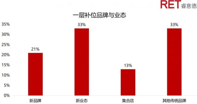 然而近年来诚如前文所言,以快时尚品牌为核心的次主力店军团也同样面临着新旧交替的周期性问题,在《快时尚下场,消费者选了谁来上场补位》一文中,RET睿意德曾分享最新的行业观察,新品牌、新业态在替代快时尚品牌的过程中,已占到50%以上的比例,而采取其他传统品牌作为面积消化手段的仅占33%。已充分说明了传统品牌作为主力店品牌集群的做法正在不被业界所采纳。同时我们也惊喜地发现了国潮品牌、个性化潮牌在购物中心里扮演的角色日益重要,并且在购物中心一层所占据的比例呈现出稳中有升的气象。