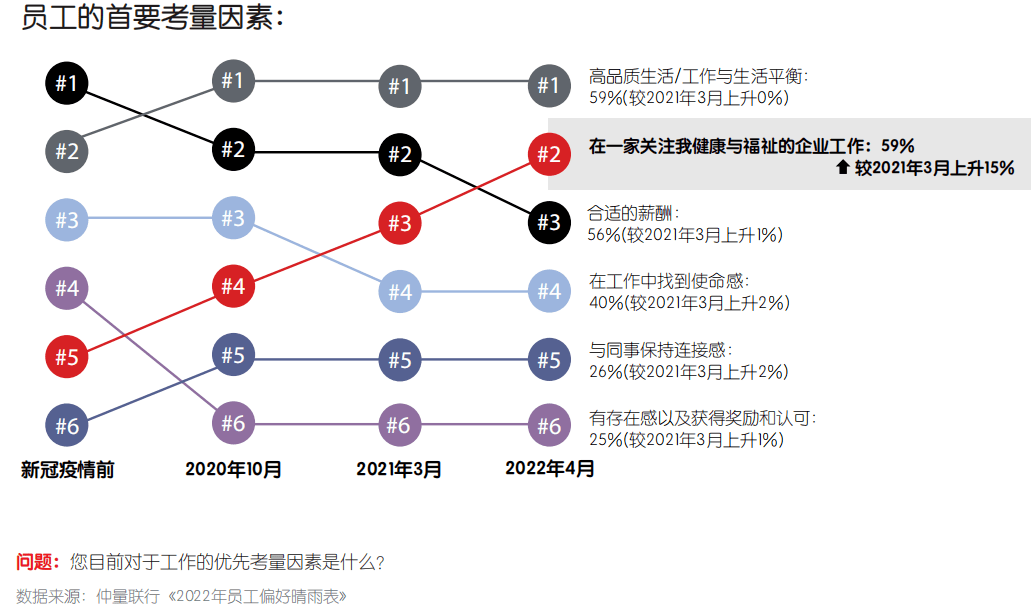 其次, 企业支持员工健康的重要性日益提升,并一路从疫情前的接近末尾升至第二位,心理健康和福祉变得比以往任何时候都更加重要。