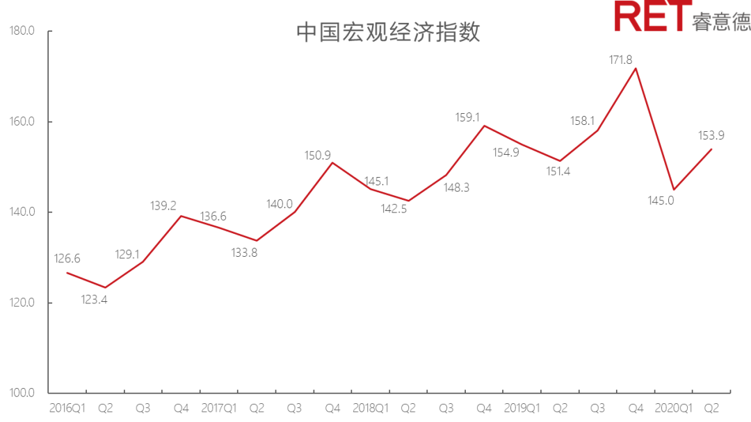 2020年第二季度,中国宏观经济指数为153.9,同比上涨6.1%,环比上涨1.7%。二季度GDP同比增长3.2%,增速较上季度上涨10个百分点,经济增长由负转正,整体经济稳步复苏。分产业来看,第三产业增加值135,122亿元,占GDP比重54.0%,较上一年同期增长1.2个百分点。