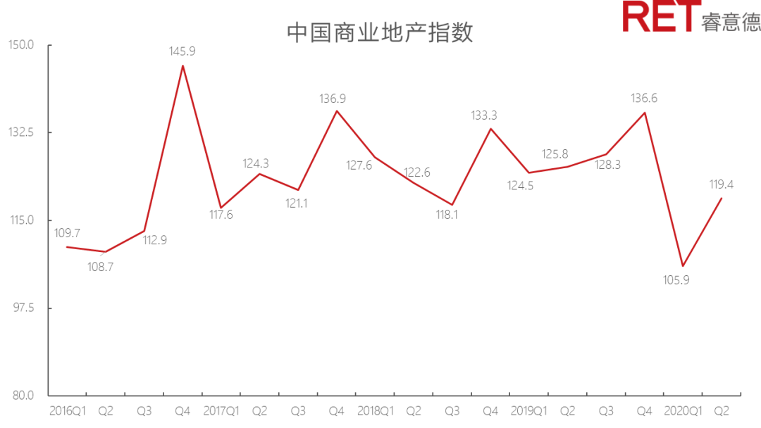 2020年第二季度,中国商业地产指数环比显著增长,同比回落幅度收窄。伴随着总体经济稳步复苏,实体商业也迎来消费回暖趋势。