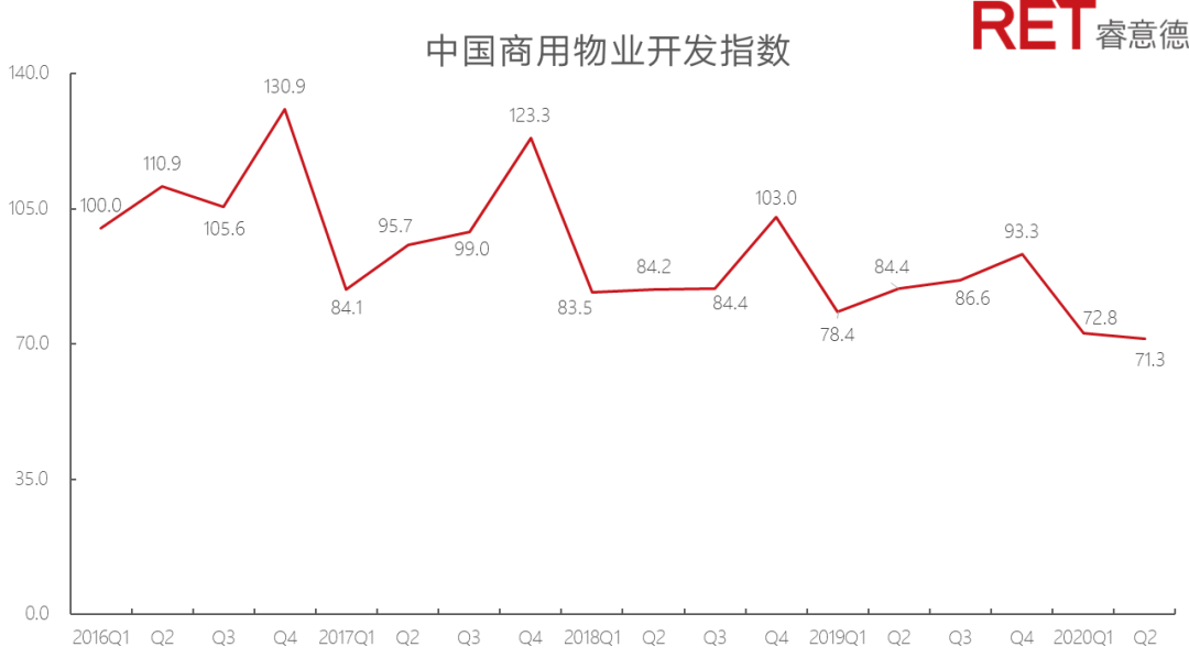 第二季度,中国商用物业开发指数为71.3,环比下降2.0%,同比下降15.5%,项目供应数量环比下降6.4%,同比下降19.7%。新增商用物业面积环比上升0.1%,同比下降13.5%。商用物业市场自一季度受到疫情冲击以来,持续低迷。