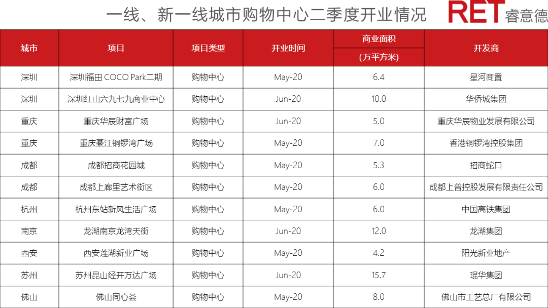 一线城市仅深圳有购物中心新项目开业。5月30日,福田星河COCO Park二期正式亮相,与一期仅隔一条马路,位于星河国际首层,由原君尚百货改造而来。项目打造了福田区最大的儿童体验地“星趣小镇”以及200平方米的无际空间艺术展览馆,入驻品牌有首进华南的安莉芳新零售体验店、麦当劳未来智慧概念餐厅、sp@ce天虹超市、Twinkle耀童亲子餐厅等。华侨城与招商蛇口联合打造的红山六九七九商业中心于6月底开业,集公园式商业街区、体验式公寓、时尚演艺剧场、人文艺术展览馆及城市精品酒店于一体,总建筑面积约34万平方米,商业部分体量约10万平方米,有华南首家自主运营开心麻花剧院、盒马鲜生、CGV影院主力店等。