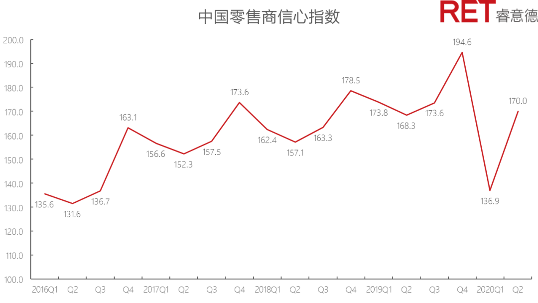 *中国零售商信心指数反映零售商在中国范围内开店拓展的投资积极性及消费者的购物积极性。中国零售商信心指数上涨说明居民消费意愿上升,零售商信心增加、拓展意愿上升。