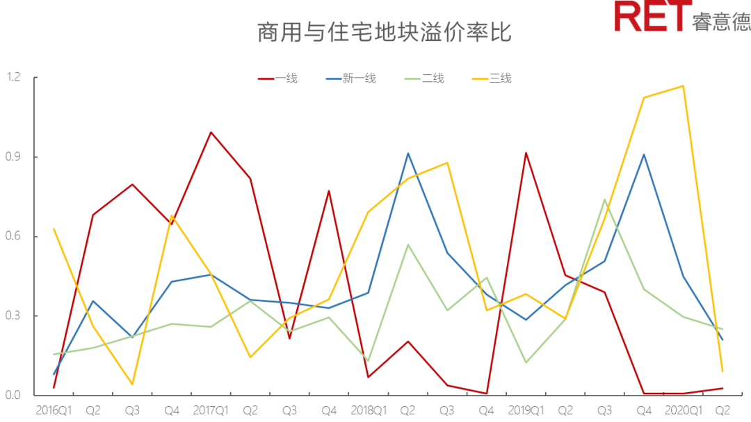 一线城市商用土地成交活跃,总计达37宗,较去年同期增加15宗,较上一季度增加9宗。其中上海商办用地成交量为27宗,占一线城市商用土地成交总量的73.0%。一线城市第二季度商办土地流拍数量与上一季度持平,商办用地成交流拍比为37.0。相比于商用土地市场,住宅土地市场二季度的平均溢价率为14.5%,活跃度更高。保利华南、保利资本、深圳裕和集团三方联合取得深圳大鹏新区青谷城市更新项目,拟建设集住宅、公寓、商业、酒店等多种业态于一体的“青谷CYAN VALLEY”综合体项目,该项目原为葵涌沙头片区旧改,总建面积约21.6万平米。