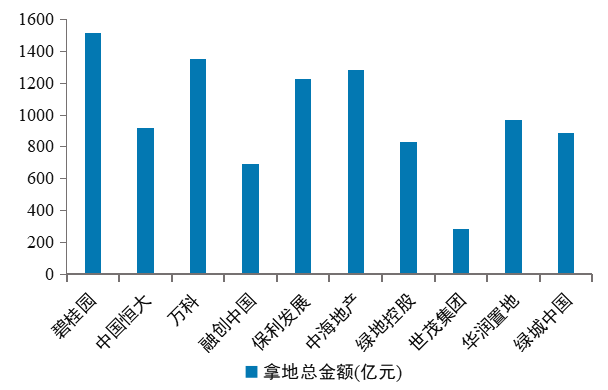 碧桂园拿地金额最高,拿地力度不断加大。2020年TOP10房企的拿地总额为9953亿元,同比增长10.7%,占全国300城土地出让金的16.6%。从单个企业层面来看,2020年碧桂园拿地总金额最高为1512亿元,拿地力度不断加大,万科紧随其后拿地总金额为1349亿元。