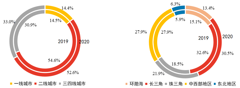 图:TOP10房企2020年拿地金额各城市等级和区域分布情况