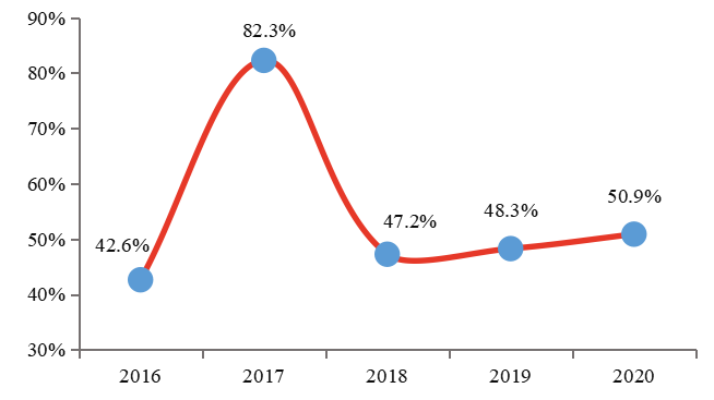 TOP10房企拿地整体较为理性。从2016-2020年TOP10房企整体拿地态度来看,2017年TOP10房企的拿地销售比为82.3%,最为激进,2018年开始转为理性,拿地销售比较2017年下降了35.1个百分点,之后保持平稳态势增长。2020年TOP10房企的拿地销售比为50.9%,较2019年上升了2.6个百分点。