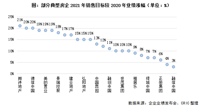 从近30家上市房企在业绩发布会披露的2021年销售目标来看,整体目标增幅有所放缓,近三成上市房企2021年的业绩目标预增低于10%,可以看出在杠杆红利消失后,企业发展以稳健、提质增效为主。