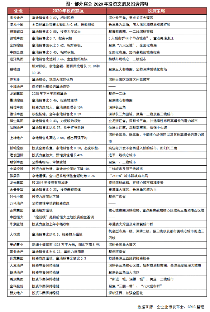 一季度末上市房企陆续公布了2020年成绩单,业绩会上部分房企透露了今年的销售目标和市场判断,这无疑对未来企业投资策略产生巨大影响。整体而言,谨慎投资仍是主旋律,区域选择仍聚焦长三角和粤港澳大湾区,且在22城集中供地之下,普遍认为提升投资质量、拓宽投资渠道是突围的核心竞争力。