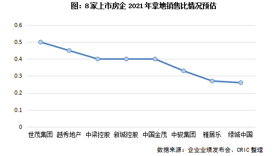 从部分公布了2021年投资预算的房企来看,不同房企的拿地销售比有较大的差异:世茂、中梁等房企提出将按销售的50%和40%比例来控制拿地,而金茂的预期的全口径投资金额为千亿左右,整体拿地销售比达到0.4。