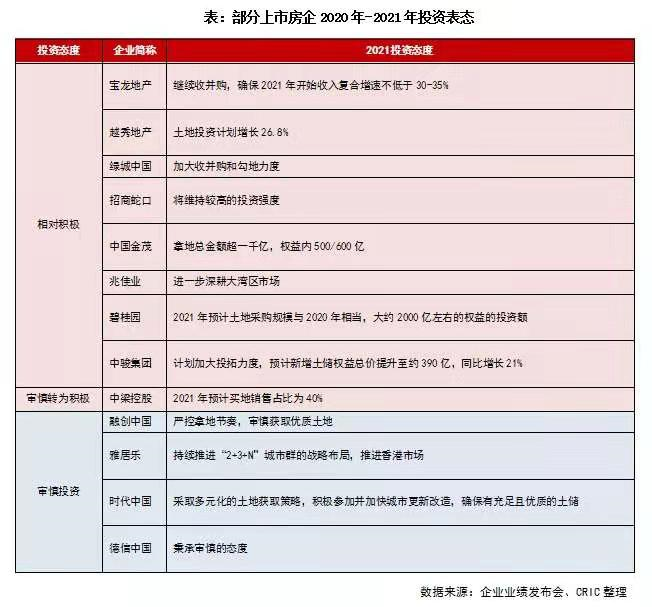 而从已公布投资意向的房企来看,投资态度呈现分化走势,以宝龙、越秀、绿城等房企表示将延续去年以来积极的投拓态势,融创、雅居乐亦或是保持审慎的投资态度。